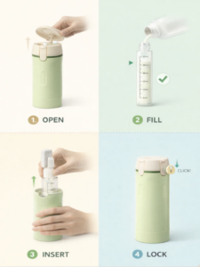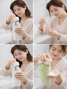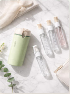 The design is smart and bottles are easy to refill. Totally satisfied.